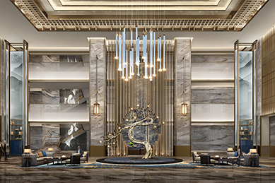 中餐廳入口處的重復金屬斗拱設計,帶來中式迎賓的尊貴儀式感,端景墻的實木陰刻風景畫,延展視覺空間,意境悠遠。中餐大廳裝飾臺的茶具、枯枝花藝,構造古樸靜雅的中式意韻,包房中形如鳳冠的藝術水晶燈,為典雅增添一抹高貴。